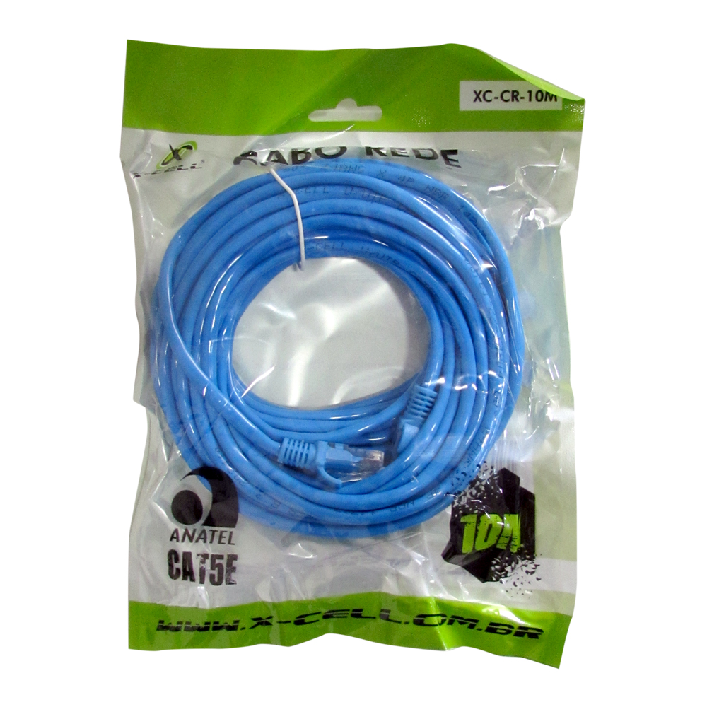 Marca: X-Cell Modelo: XC-CR-10M Conector: RJ45 Macho x RJ45 Macho Padrão: Cat 5e Cor: Azul Comprimento: 10 metros Revestimento: PVC de alta performance Isolamento: Polietileno de alta densidade