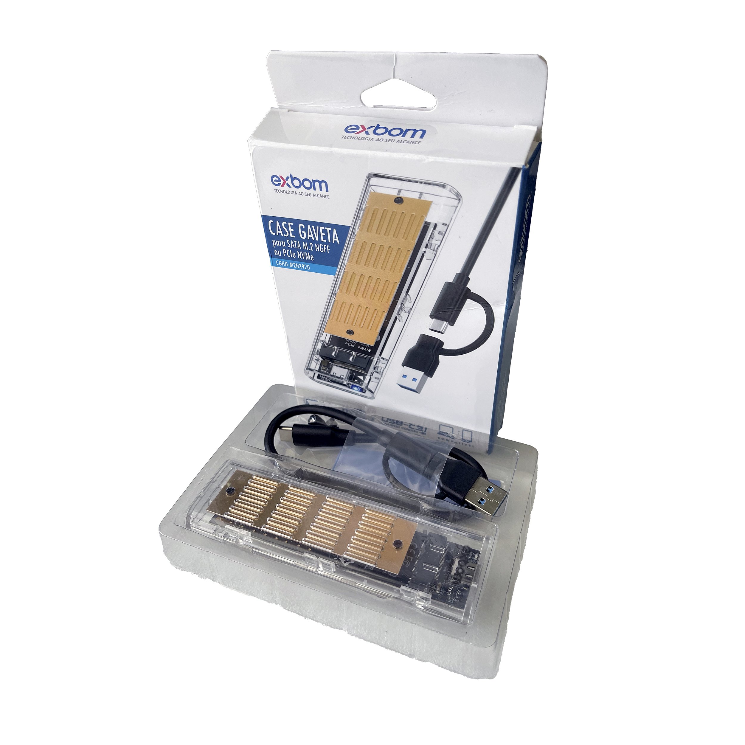 Marca: Exbom Modelo: M2NX920 Adaptador: NVMe m2 ou sata NGFF Cor: Transparente Material: ABS Tipo de disco suportado: SSD Velocidade de transmissão: 5MB/s Interfaces internas: M.2, NGFF, NVMe, SATA I Interfaces externas: USB 3.1, USB 3.0, USB 2.0, USB 1.1 Inclui cabo USB: Sim Com indicador LED: Sim Inclui acessórios: Sim Acessórios incluídos: Manual Largura: 4cm Altura: 1cm Peso: 24g